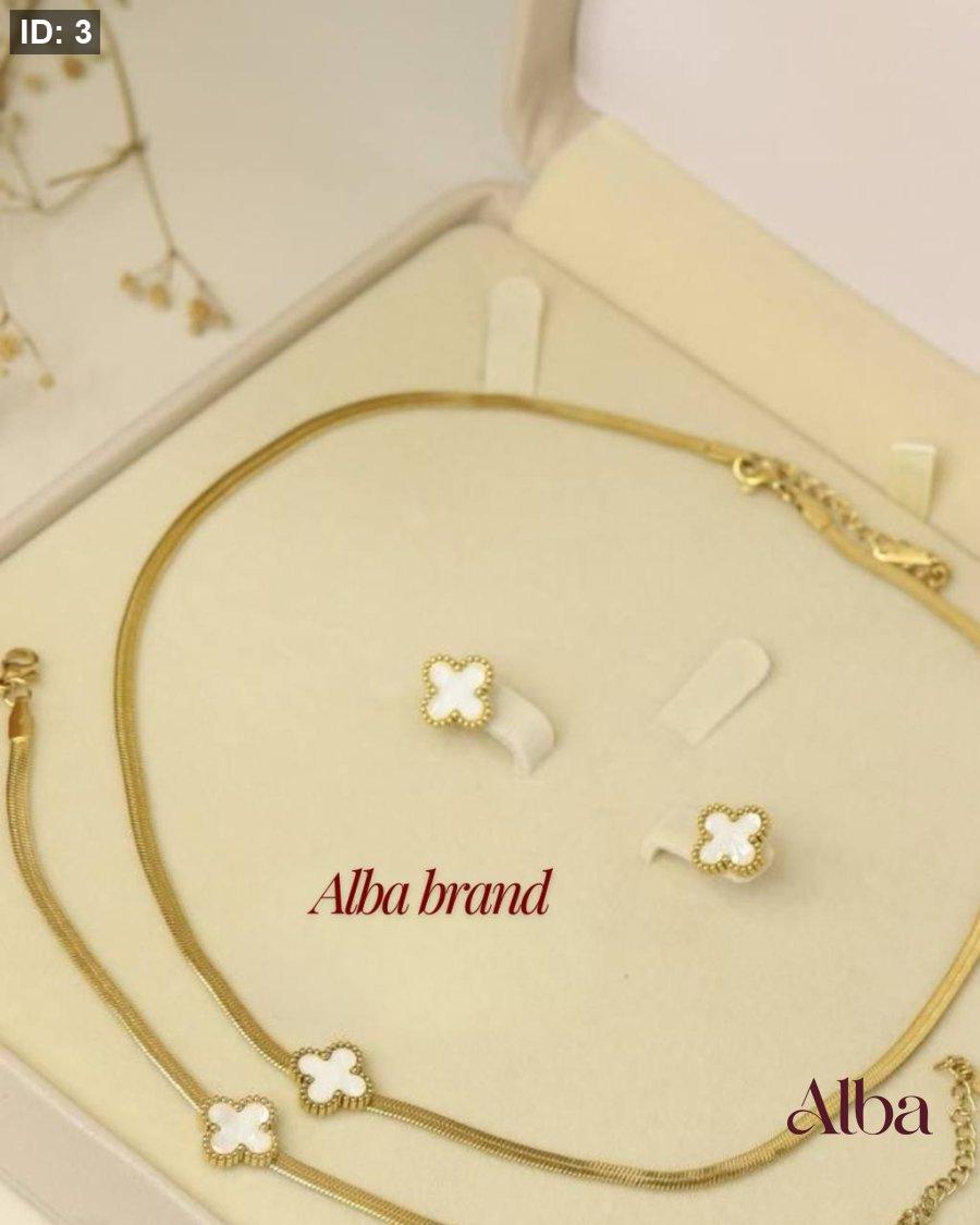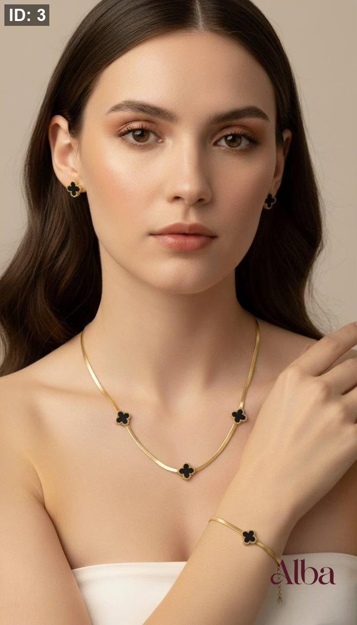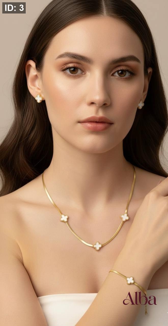 طقم فاخر مستوحى من زخرفة زهرة البرسيم (ألامبرا)، يتألف من عقد، سوار، وحلقان، مرصع بقطع عرق اللؤلؤ الأبيض الراقية. هذا الطقم مصنوع بتقنية عالية تضمن ثبات اللون الذهبي وعدم تغييره أو بهتانه مع الاستخدام اليومي. قطعة أيقونية مثالية للإهداء ولإضافة لمسة من الفخامة الخالدة إلى إطلالتك.