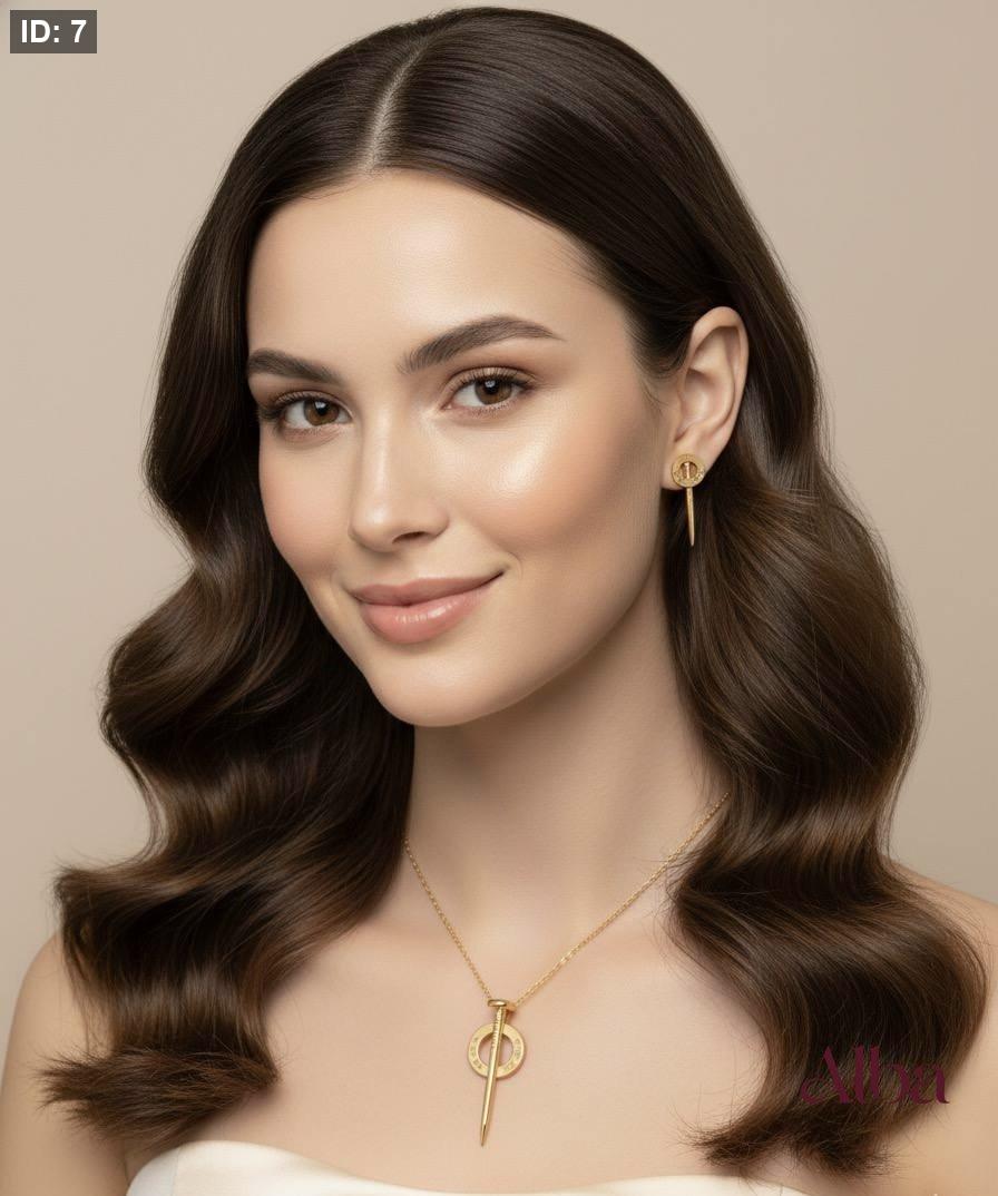 تألقي بتصميم فريد يمزج بين الجرأة والرقي مع هذا الطقم المميز من "آلبا براند". تصميم إبداعي بشكل المسمار وحلقة الدائرة يضفي لمسة عصرية وفخمة على إطلالتك. مكون من عقد و حلق. الميزة الأهم: لون ثابت لا يزول أبدًا. جودة مصممة لتبقى دائمة اللمعان.